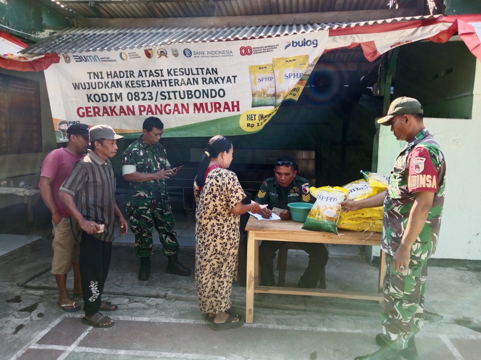 Dalam kegiatan yang dipimpin Ws. Danramil 0823/05 Panarukan Pelda Sulaiman itu, disalurkan 2 ton beras SPHP atau setara 400 sak dengan isi 5 kilogram per sak.