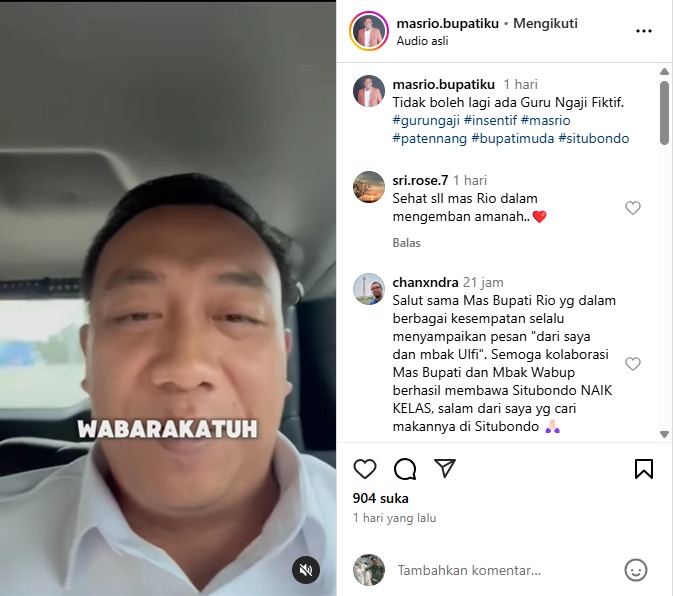 SITUBONDO - Bupati Situbondo, Yusuf Rio Wahyu Prayogo mengatakan, bahwa pembagian insentif kepada guru ngaji dimulai pada minggu depan. Pernyataan tersebut disampaikan pria yang akrab disapa Mas Rio ini lewat video yang dibagikan di akun Instagram pribadinya.