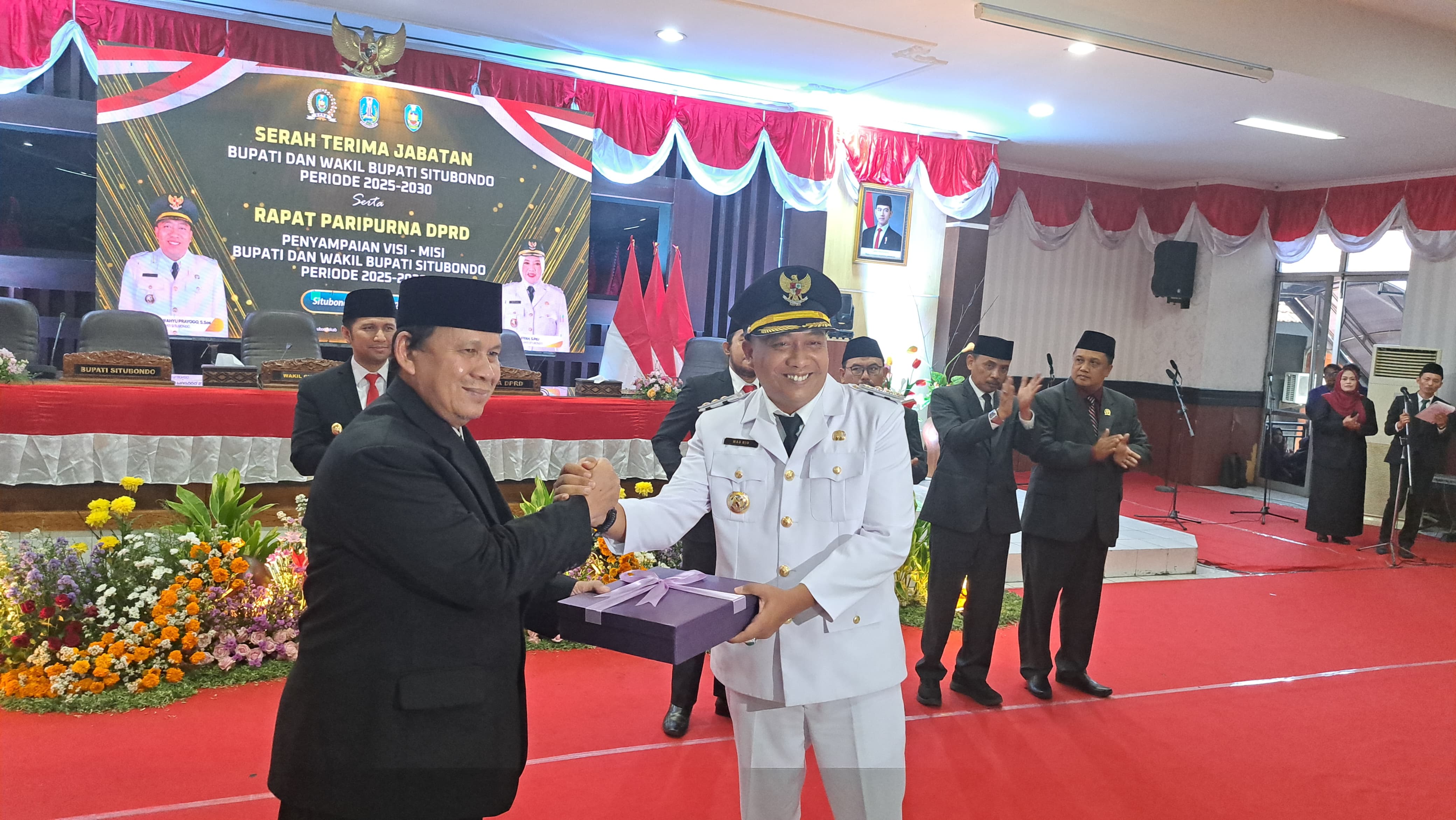 SITUBONDO - Gubernur Jawa Timur, Khofifah Indar Parawansa dan Bupati Situbondo, Karna Suswandi menghadiri Panen Perdana Padi BK Situbondo 01 Agritan dan Padi BK Situbondo 02 Agritan, Selasa (23/5/2023). Acara tersebut berlangsung di Lahan Demfarm, Kelompok Tani Rejeki Agung dan Agung Mulya, Kelurahan Mimbaan, Kecamatan Panji, Kabupaten Situbondo.